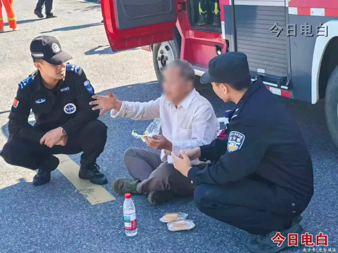 (民警及时为老人提供面包和水补充能量,老人向民警讲述迷路被困经过并再三感谢大家的救援)