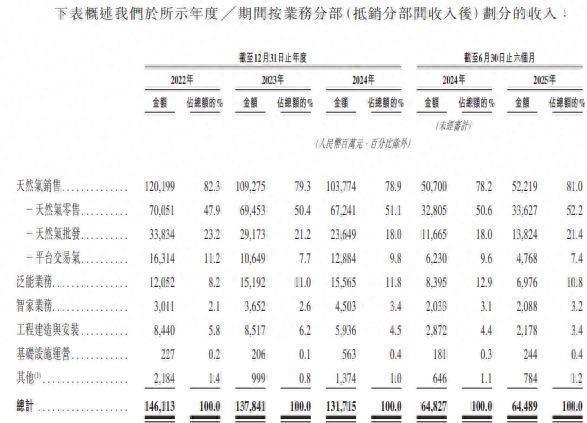 该公司以多种形式向客户提供天然气,主要包括PNG、LNG及CNG,其中零售模式下客户包括居民用户、工商业客户及汽车加气站,工商业客户为主要的需求来源,2025年上半年销量占比业务79.25%,而居民用户为19.8%。而市场主要为华东、华南及西南,占比分别达57.7%及19%。零售销量及价格均较为稳定,该业务收入波动性较小。