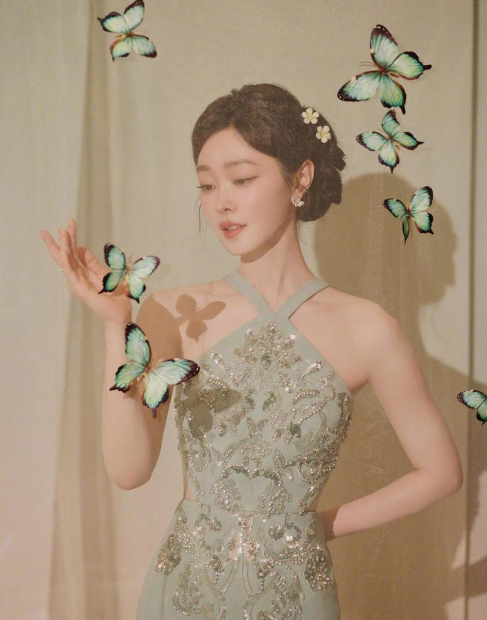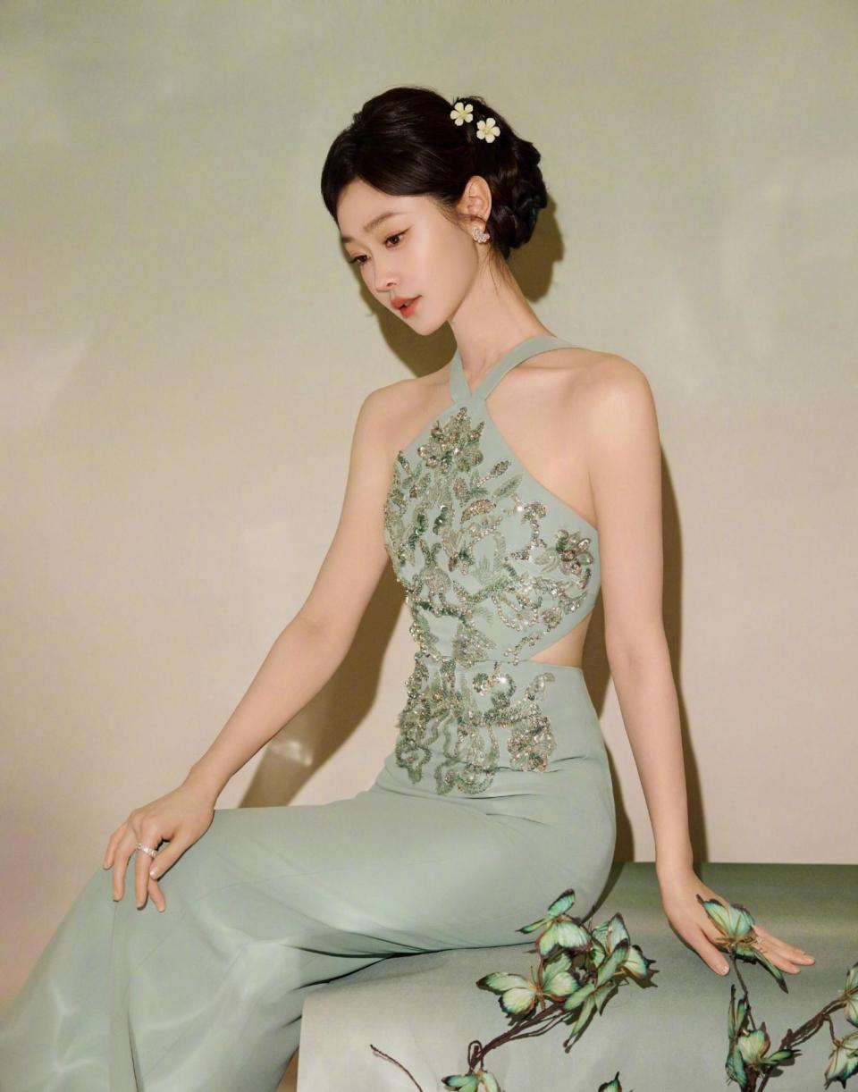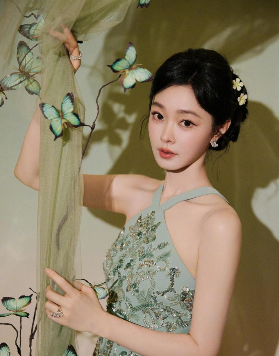 但她压根没停。 从新中式刺绣抹胸裙到宋制汉服簪花造型,从街头甜酷风到红毯性感女王,每个月一个爆款造型的速度刷新认知。 这次绿裙加蝴蝶发饰,又是一次精准的审美输出——温柔但不软弱,疏离但不冷漠。