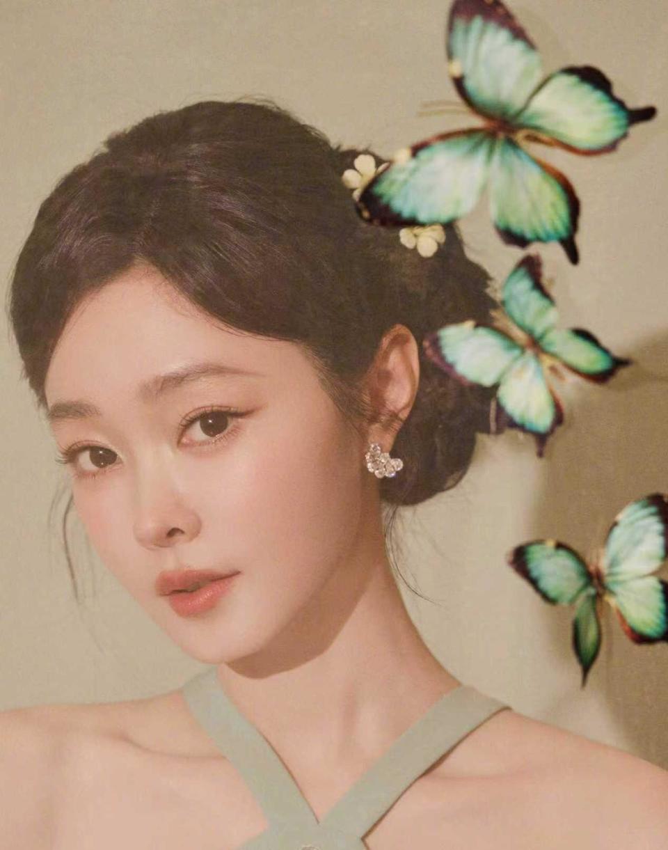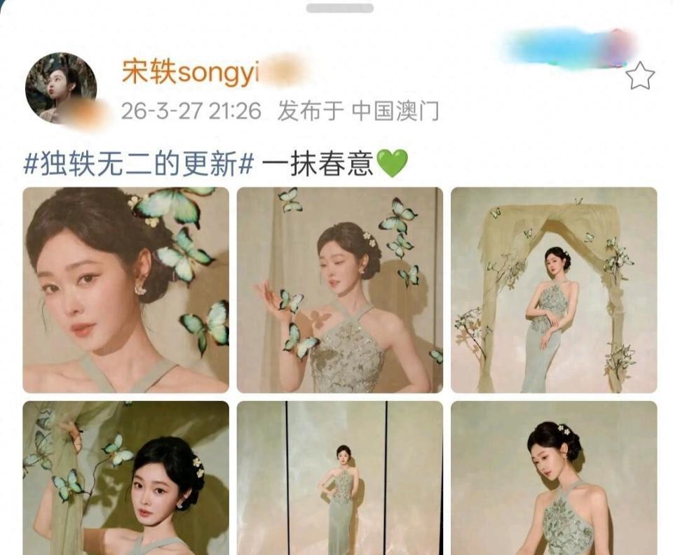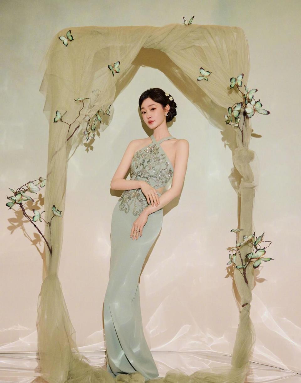 但她压根没停。 从新中式刺绣抹胸裙到宋制汉服簪花造型,从街头甜酷风到红毯性感女王,每个月一个爆款造型的速度刷新认知。 这次绿裙加蝴蝶发饰,又是一次精准的审美输出——温柔但不软弱,疏离但不冷漠。