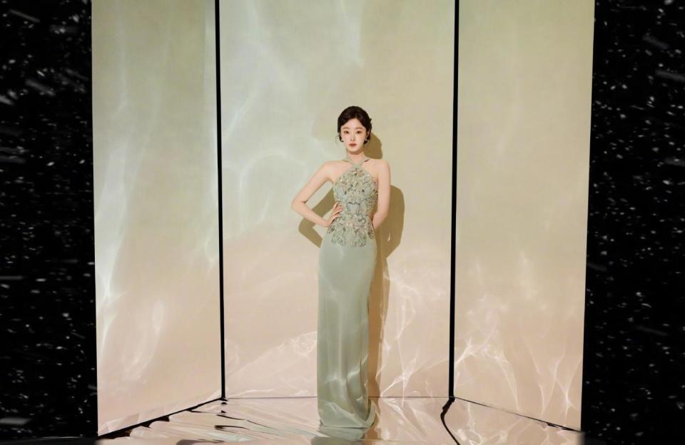 有人拿她年初那条ELIESAAB深V亮片裙来比。 那会儿她走的是性感女王路线,深V开到腰腹,高垫的假发片还被网友调侃像“不明生物脑壳”。 但这次完全不一样,挂脖绿裙把她拉回了清冷美人赛道,那种距离感反而更抓人。